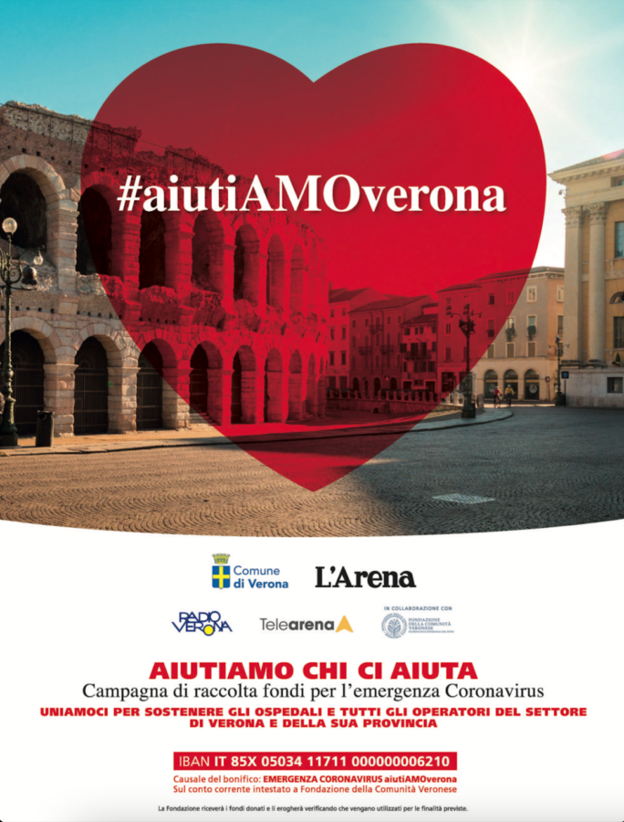 La Raccolta Fondi è stata promossa dal giornale L’Arena, Telearena, Radio Verona e dal Comune di Verona in collaborazione con la Fondazione della Comunità Veronese, con l’obiettivo di dare una risposta tempestiva alle necessità più urgenti per far fronte all’emergenza sanitaria, originata dal Coronavirus, a Verona e provincia.