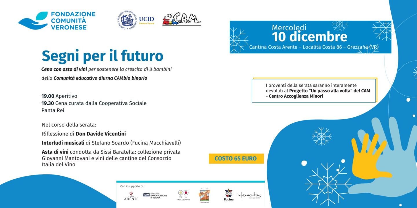 L’intero ricavato della serata sarà devoluto al sostegno del progetto “Un passo alla volta” del CAM – Centro Accoglienza Minori con sede in Borgo Roma: il progetto mira a offrire a otto bambini seguiti dalla Comunità qualcosa che per molti è scontato: la possibilità di essere seguiti, accolti e aiutati a crescere. Grazie al vostro contributo potranno iniziare percorsi di psicomotricità e arte terapia utilizzati sia per sostenere difficoltà cognitive e relazionali, sia per aiutare i bimbi ad esternare emozioni e vissuti difficili da esprimere a parole. Questi due interventi, uniti al sostegno psicologico, vogliono essere strumenti concreti per aiutare questi bambini a rielaborare la propria storia, rafforzare l’autostima e sviluppare competenze utili per la costruzione del proprio futuro.