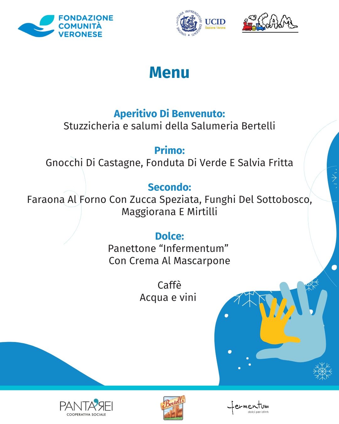 La cena, organizzata dalla Fondazione della Comunità Veronese in collaborazione con UCID (Unione Cristiana Imprenditori Dirigenti), sarà preparata e servita dai cuochi e camerieri della Cooperativa Panta Rei, che dal 2001 promuove l’inserimento lavorativo di persone con disagio mentale.